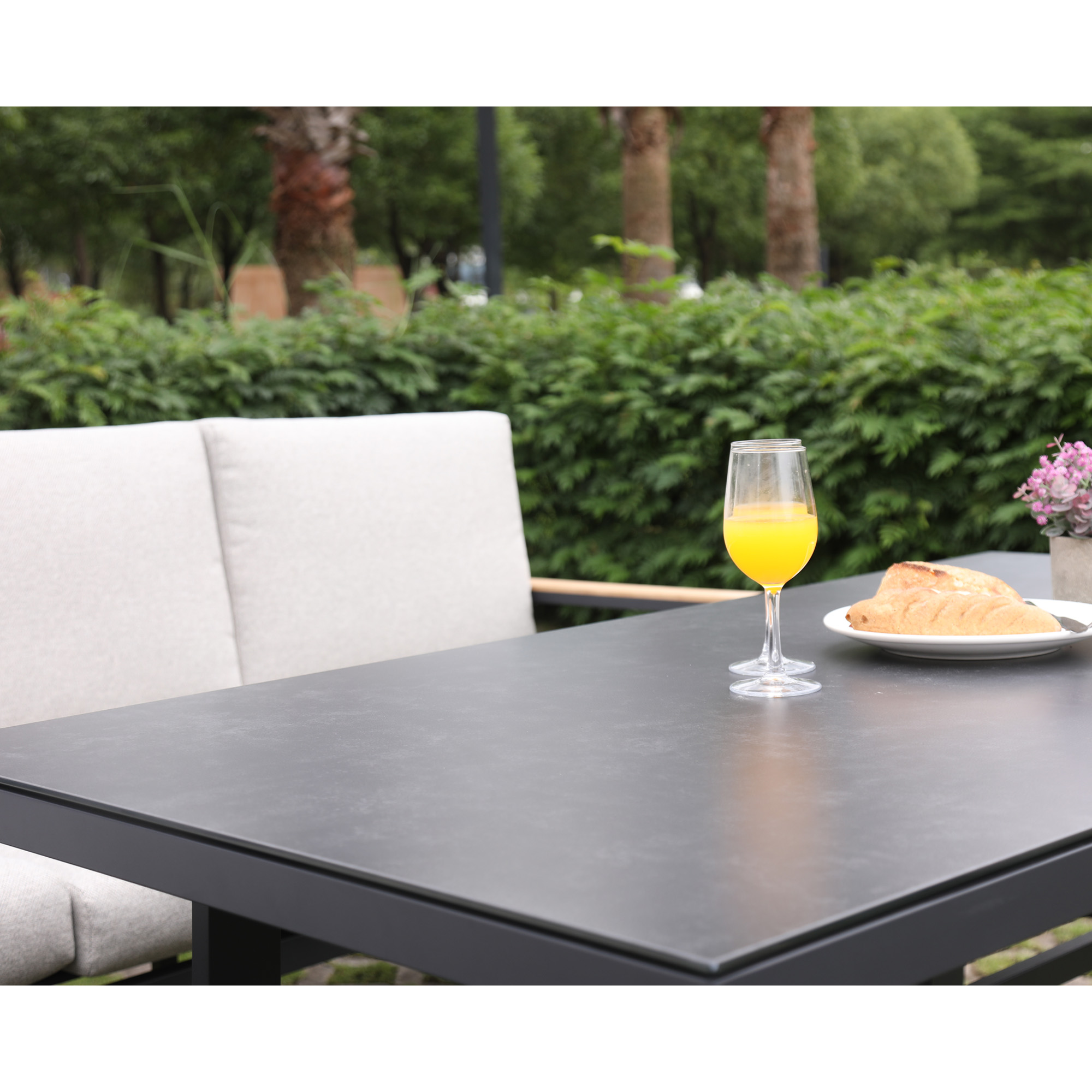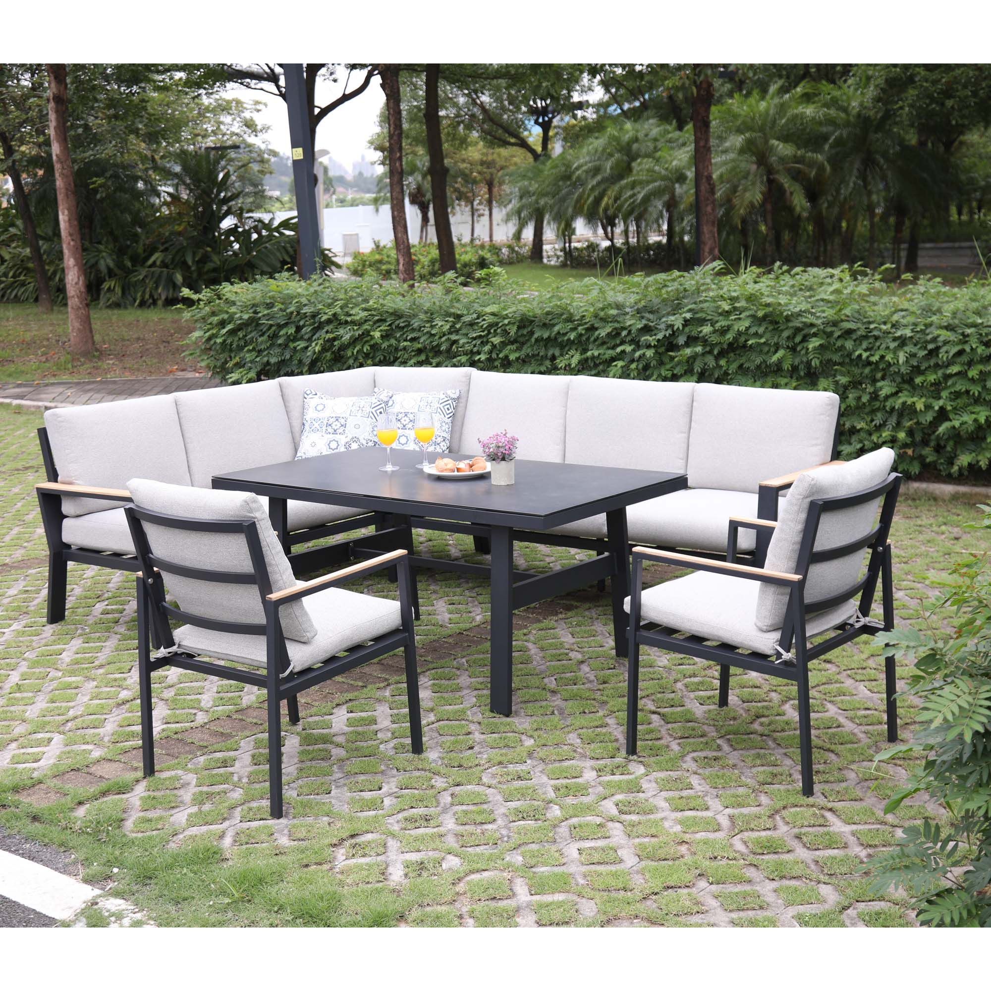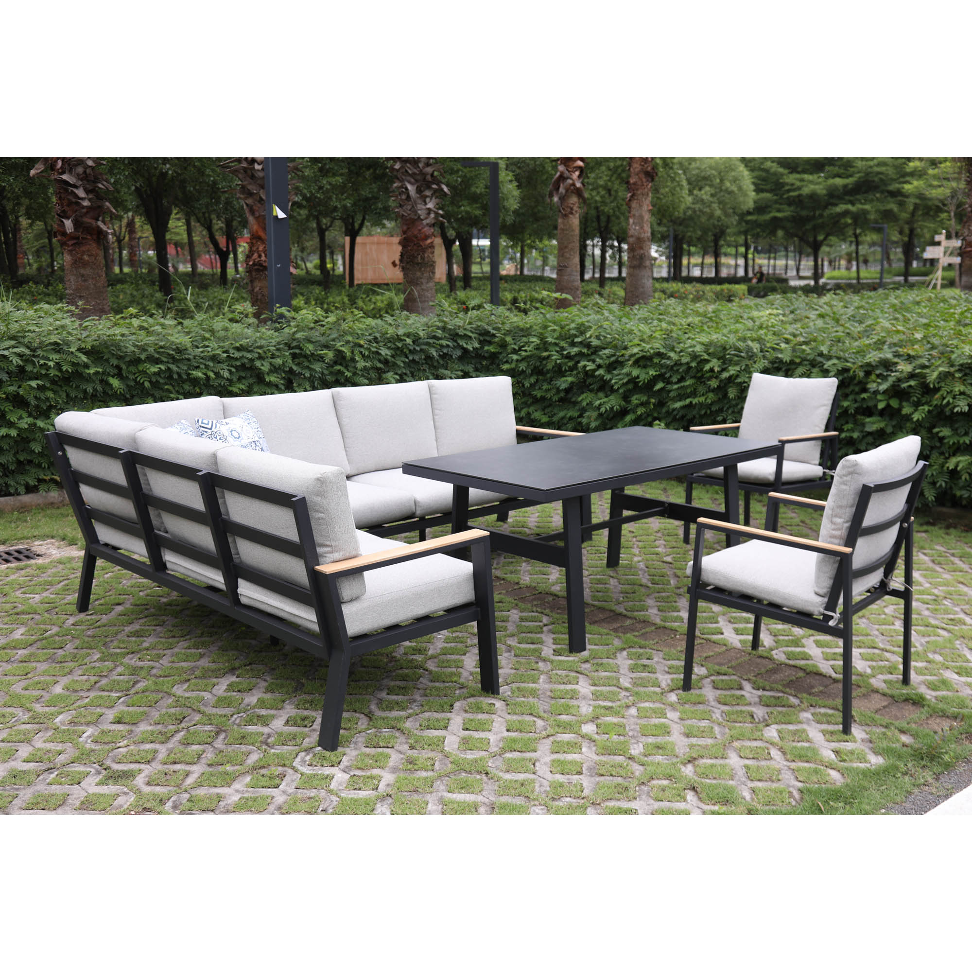 Material: Powder coated aluminum frame & high quality outdoor fabric teak armrest & ceramic glass table top